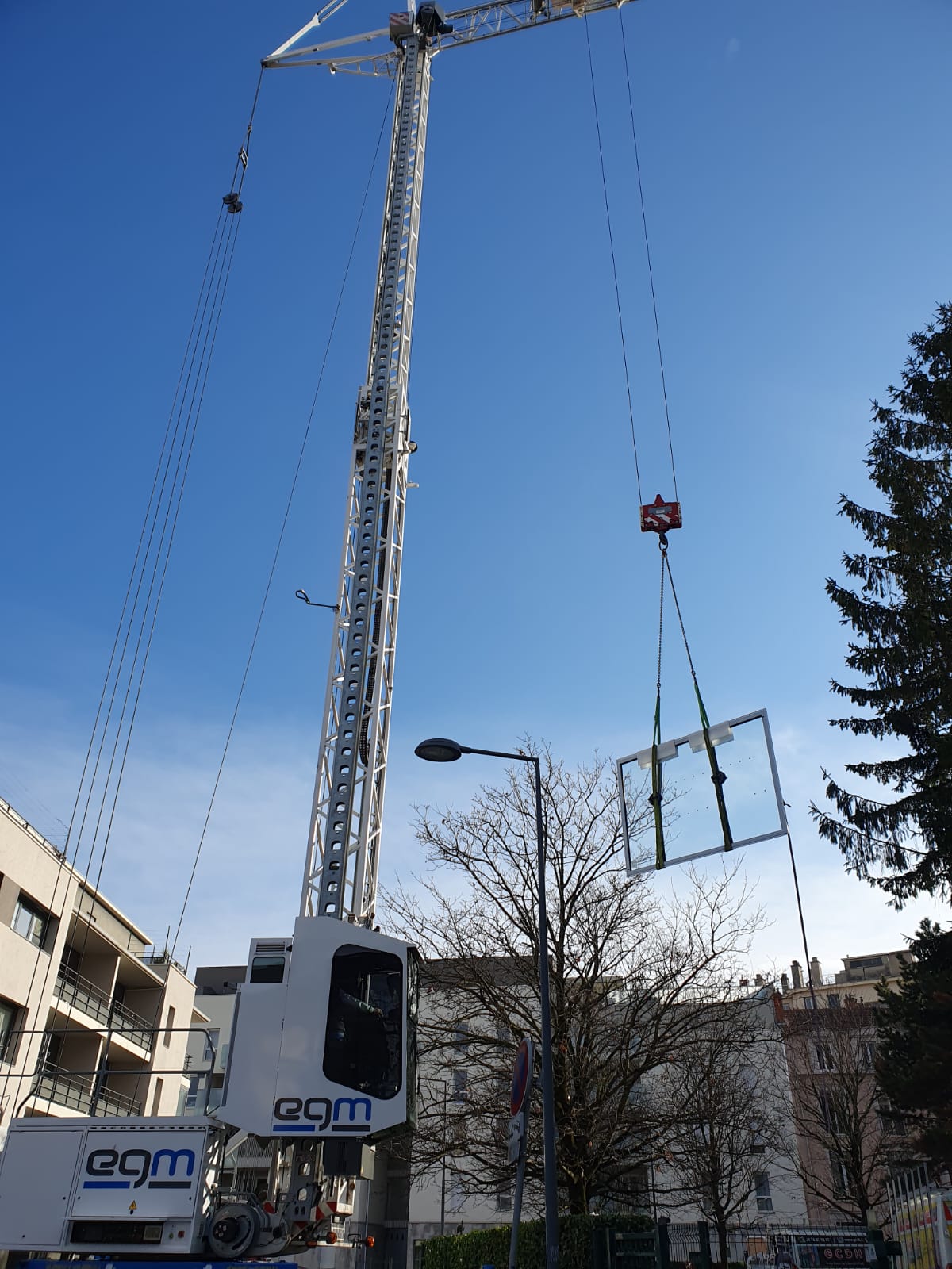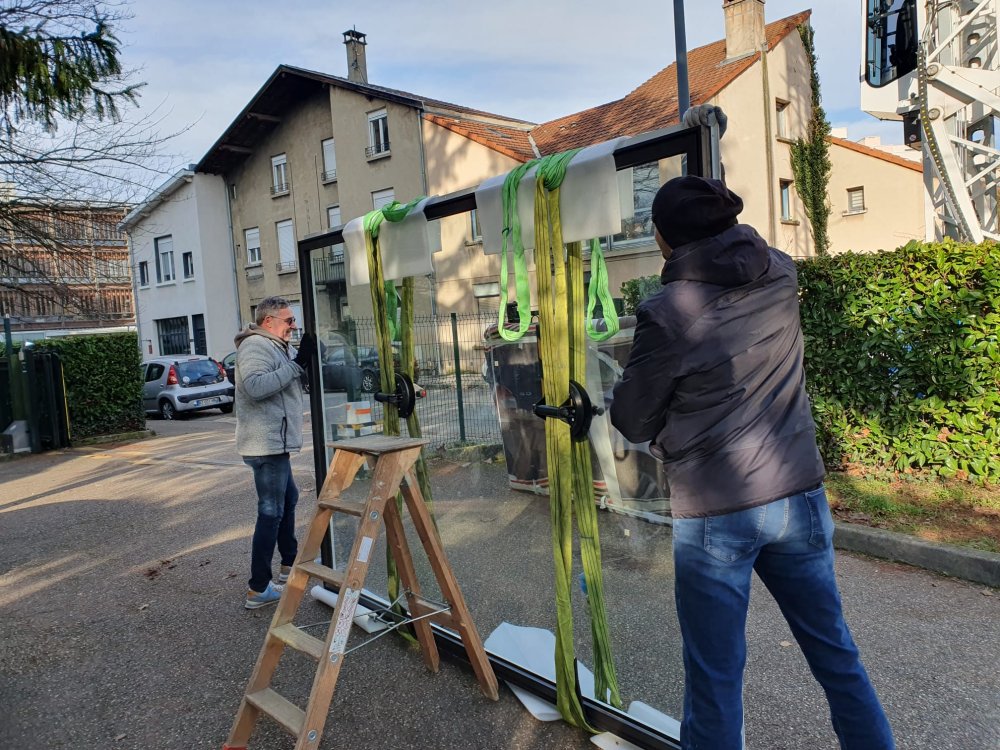 Ce chantier technique nécessitait l’intervention d’une grue de levage afin d’installer en toute sécurité cette menuiserie de grande dimension.